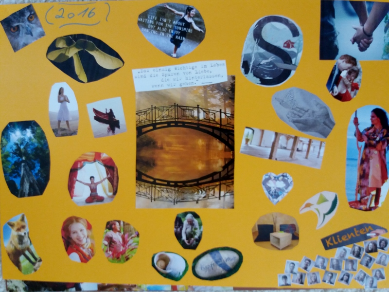 Ich wollte mich nochmal für den wunderbaren Tag mit Dir bedanken! Die Gruppe war so fruchtbar, es war ein schönes kreatives Getragenen sein. Ein ganz zwangloses Miteinander - jeder für sich und trotzdem gemeinsam. Meine Jahrescollage hängt nun in meiner Praxis! Ich erfreue mich jeden Tag daran, sie ist mir Motivation, Wegweiser und Mahnung! Ich freue mich sehr auf weitere gemeinsame Wege mit Dir! Wie auch immer Sie aussehen?!